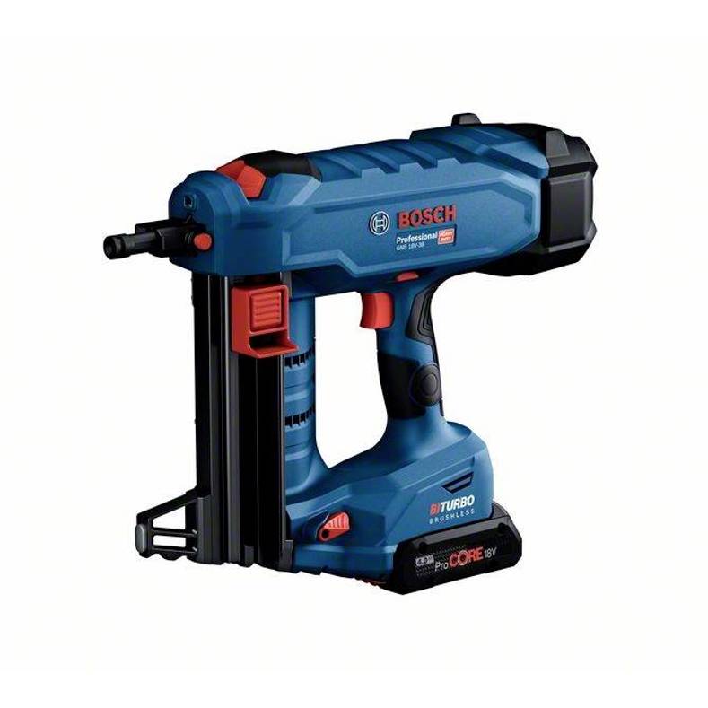 Bosch Akku-Betonnagler GNB 18V-38Die Befestigung von Stahlprofilen auf harten Materialien wie Beton und Stahl muss leicht, effizient und intuitiv sein.Der GNB 18V-38 Professional hilft dir bei dieser Arbeit.Er wird von unserer kraftvollen BITURBO Brushless Technologie angetrieben und gehört zum Bosch Professional 18V System.Du brauchst nur einen ProCORE18V-Akku und schon kann es losgehen - es sind keine zusätzlichen Gaskartuschen notwendig.Wir haben ein zuverlässiges Befestigungssystem entwickelt, das sowohl Werkzeug als auch Nägel umfasst.Dadurch kannst du dich voll auf deine Arbeit konzentrieren.Die zertifizierten, verzinkten Karbonstahlnägel gewährleisten eine lange Lebensdauer in Beton und Stahl.Wir bieten ein Sortiment an Nägeln von 16 bis 38 mm für Beton, und 13 bis 19 mm für Anwendungen in Stahl.Werkzeug und Nägel sind gemäß ETA oder ICC geprüft und zertifiziert.Kompatibel mit dem Bosch Professional 18V System und mit der markenübergreifenden AMPShare Akku Allianz.Im Lieferumfang enthalten:1 x XL-BOXX-Einlage für GNB 18V-38/40 (1 600 A02 R2X)1 x Ausdrückstift (1 600 A03 42F)1 x Befestigungshaken (1 600 A02 K07)2 x Akku ProCORE18V 4.0Ah (1 600 A01 6GB)Schnellladegerät GAL 18V-40 Professional (1 600 A01 9RJ)