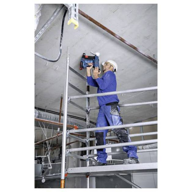 Akku-Nagler GNB 18V-40, Die Befestigung von Kabeln und Kabelschutzrohren auf harten Materialien wie Beton und Stahl muss leicht, effizient und intuitiv sein. Der GNB 18V-40 Professional hilft dir bei dieser Arbeit. Er wird von unserer kraftvollen Brushless Motortechnologie angetrieben und gehört zum Bosch Professional 18V System. Du brauchst nur einen ProCORE18V-Akku und schon kann es losgehen - es sind keine zusätzlichen Gaskartuschen notwendig. Wir haben ein zuverlässiges Befestigungssystem entwickelt, das sowohl Werkzeug als auch Nägel und Kabelbefestigungselemente umfasst. Dadurch kannst du dich voll auf deine Arbeit konzentrieren. Die zertifizierten, verzinkten Karbonstahlnägel gewährleisten eine lange Lebensdauer in Beton und Stahl. Wir bieten ein Sortiment an Nägeln von 16 bis 40 mm für Beton, und 13 bis 19 mm für Anwendungen in Stahl. Werkzeug und Nägel sind gemäß ETA oder ICC geprüft und zertifiziert. Kompatibel mit dem Bosch Professional 18V System und mit der markenübergreifenden AMPShare Akku Allianz. 1 x XL-BOXX (1 600 A02 59V). 1 x XL-BOXX-Einlage für GNB 18V-38/40 (1 600 A02 R2X). 1 x E-Mundstück für GNB 18V-38/40 (1 600 A03 42E). 1 x Magnet für GNB 18V Standard-Mundstück (1 600 290 074). 1 x Standard-Mundstück für GNB 18V (1 600 A02 HL3). 1 x Ausdrückstift (1 600 A03 42F). 1 x Befestigungshaken (1 600 A02 K07)