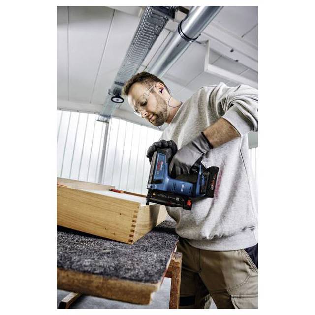 Akku-Holznagler GNH 18V-35, Der Holznagler GNH 18V-35 ist die kabellose Lösung für die Präzisionsbefestigung, die dank reduziertem Rückstoß und kratzfreien Pads mit unterschiedlichen Auflageflächen für verschiedene Anwendungen dein Werkstück frei von Spuren hält. Er liefert auch bei schwierigen Winkeln perfekte Arbeitsergebnisse mit präziser Führung von Schlagstempel und Stift. Und dank des bürstenlosen Motors und des optimierten Schraubenfedersystems werden die Stifte konstant mit voller Leistung versenkt. Durch die Trockenschuss-Sperre ist dein Werkstück vor Beschädigungen geschützt, in dem Leerschüsse bei leerem Magazin verhindert werden. Darüber hinaus lässt sich die Tiefe mit der stufenlosen Tiefeneinstellung dieses Werkzeugs schnell und einfach verstellen Der GNH 18V-35 ist für Holzanwendungen vorgesehen und kann für filigrane Zierleisten und Leisten an Möbeln und Gebäuden verwendet werden sowie um Glasleisten in Möbeln oder Türen/Innenwänden zu befestigen. Empfohlene Stifte: Bosch PN23 G: 15, 19, 30, 35 mm. 23 ga / 0,6 mm Das Gerät wird mit einem Kontaktauslöser für die Einzel- und Serienauslösung, einer LED-Leuchte und einem Gurthaken geliefert L-BOXX 136 (1 600 A01 2G0). 1 x Gürtelhaken (2 609 111 584)