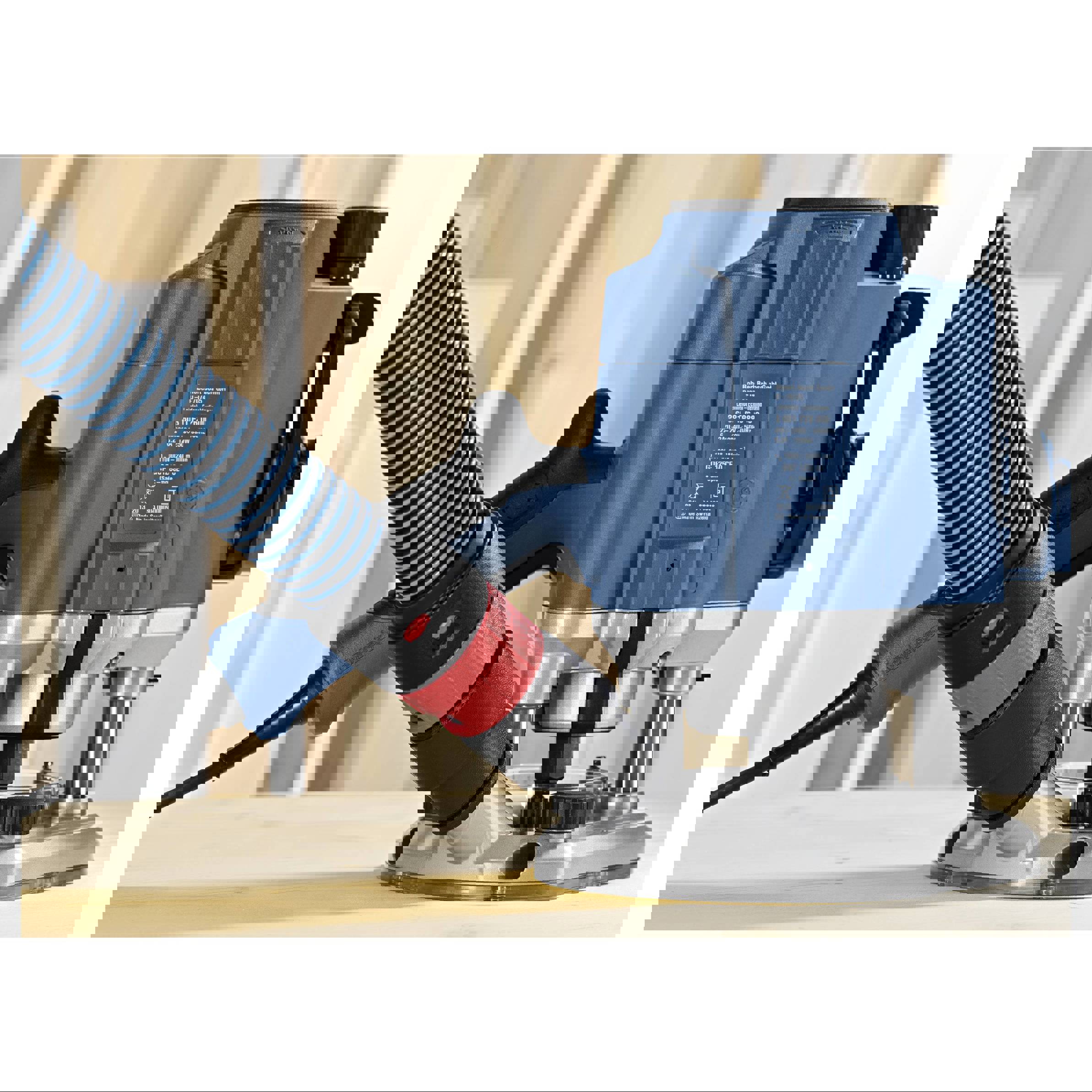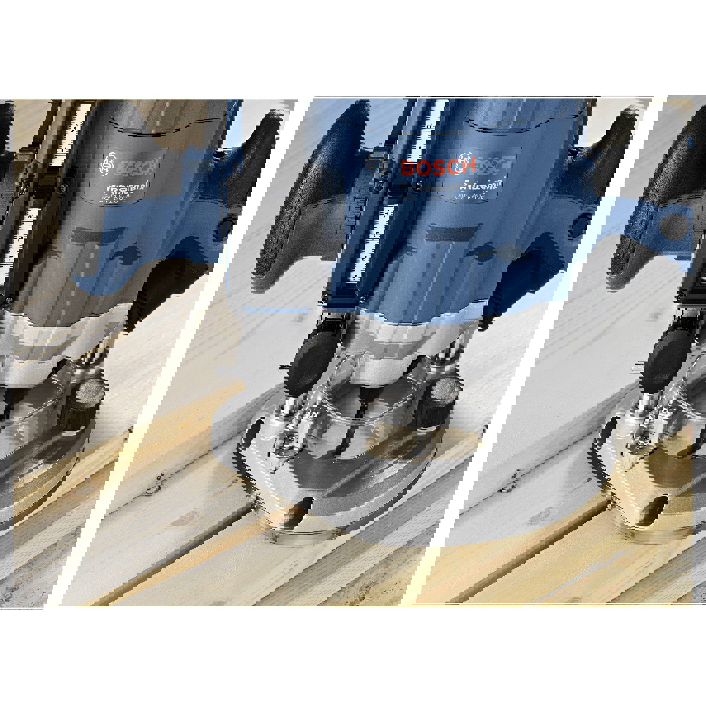 Oberfräse mit einfachen und schnellen Fräserwechsel durch neue patentierte Spindelarretierung mit Parkposition und komfortablen Abstellen durch flachen Gehäusedeckel. Durchzugsstarker 1250 Watt Motor mit Constant-Electronic und Softstart für materialgerechtes Arbeiten. Patentierte Frästiefen-Feineinstellung in 1/10-mm Schritten bei fixierter Tauchfunktion.