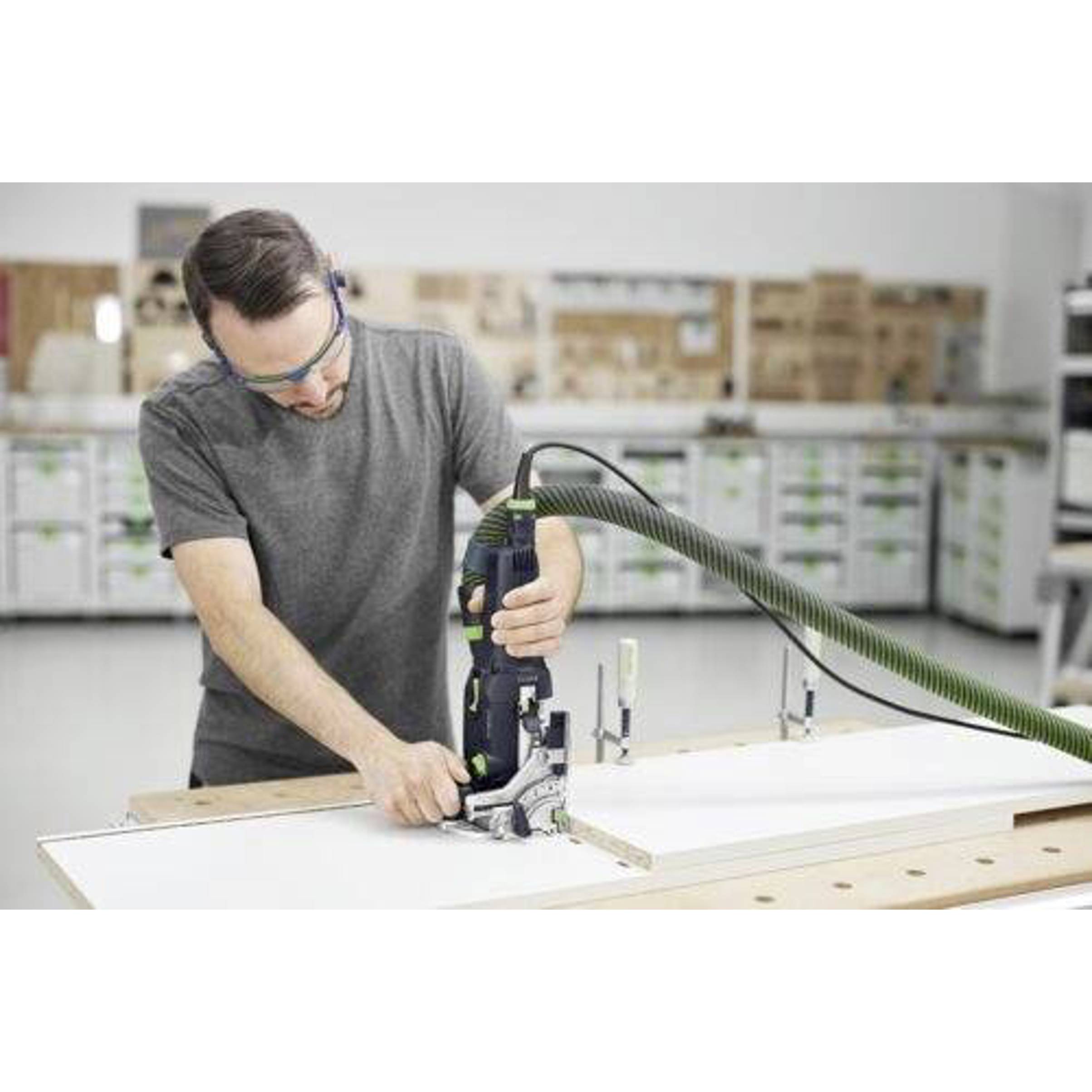 Mit dem Frästiefenanschlag sind voreingestellte Frästiefen mit 12 mm, 15 mm, 20 mm, 25 mm und 28 mm möglich. Die Frästiefen sind optimal auf die Dübel und Plattenmaterialien abgestimmt.