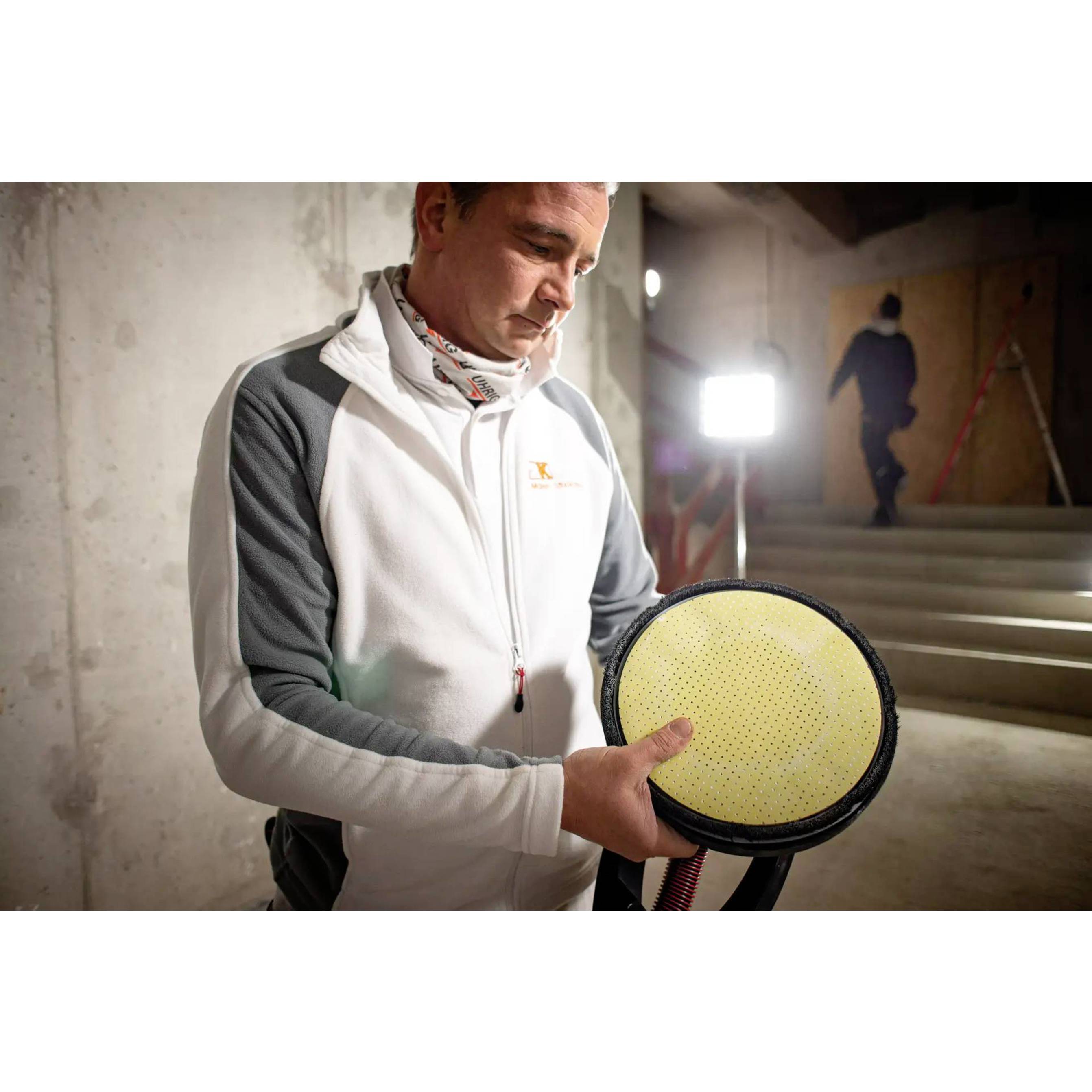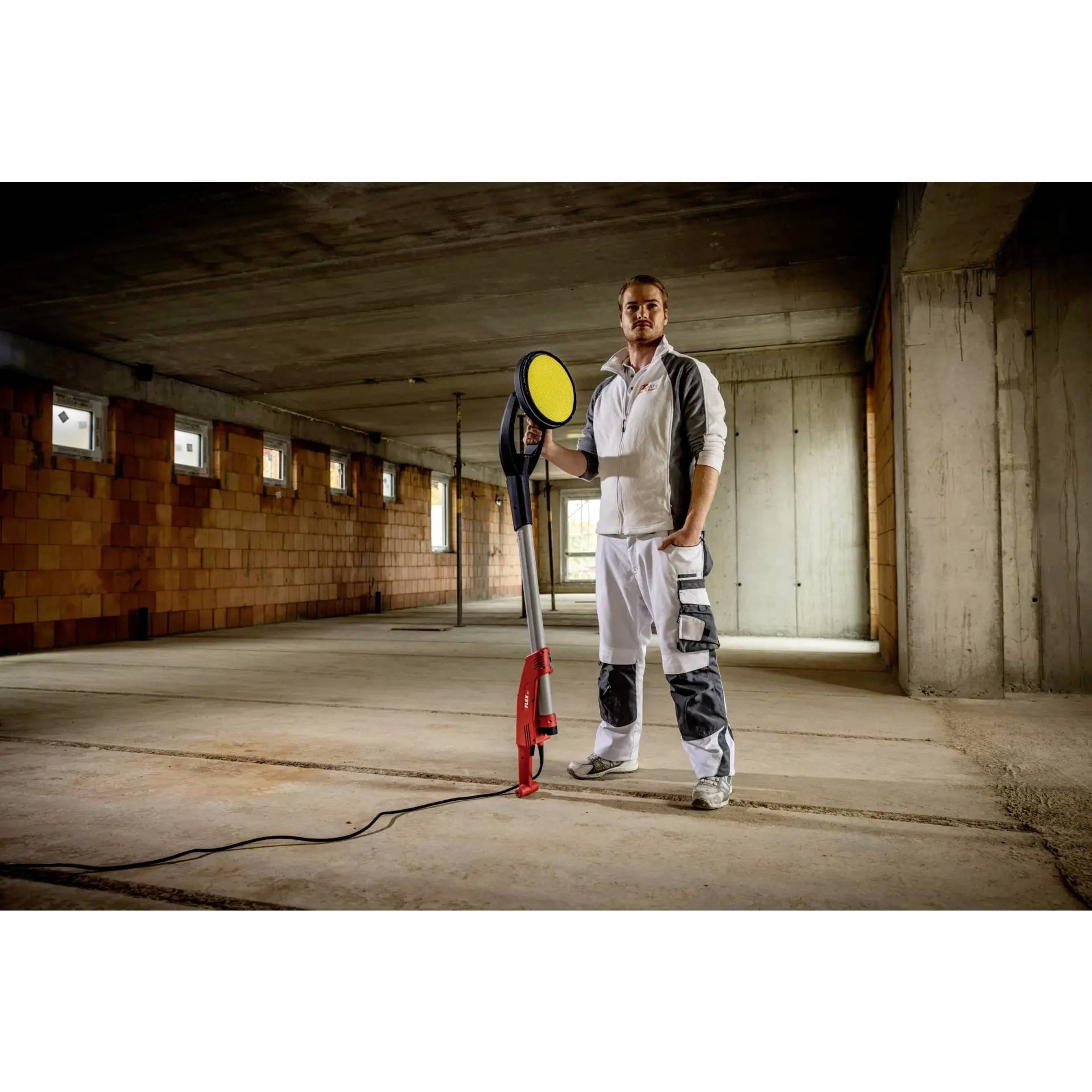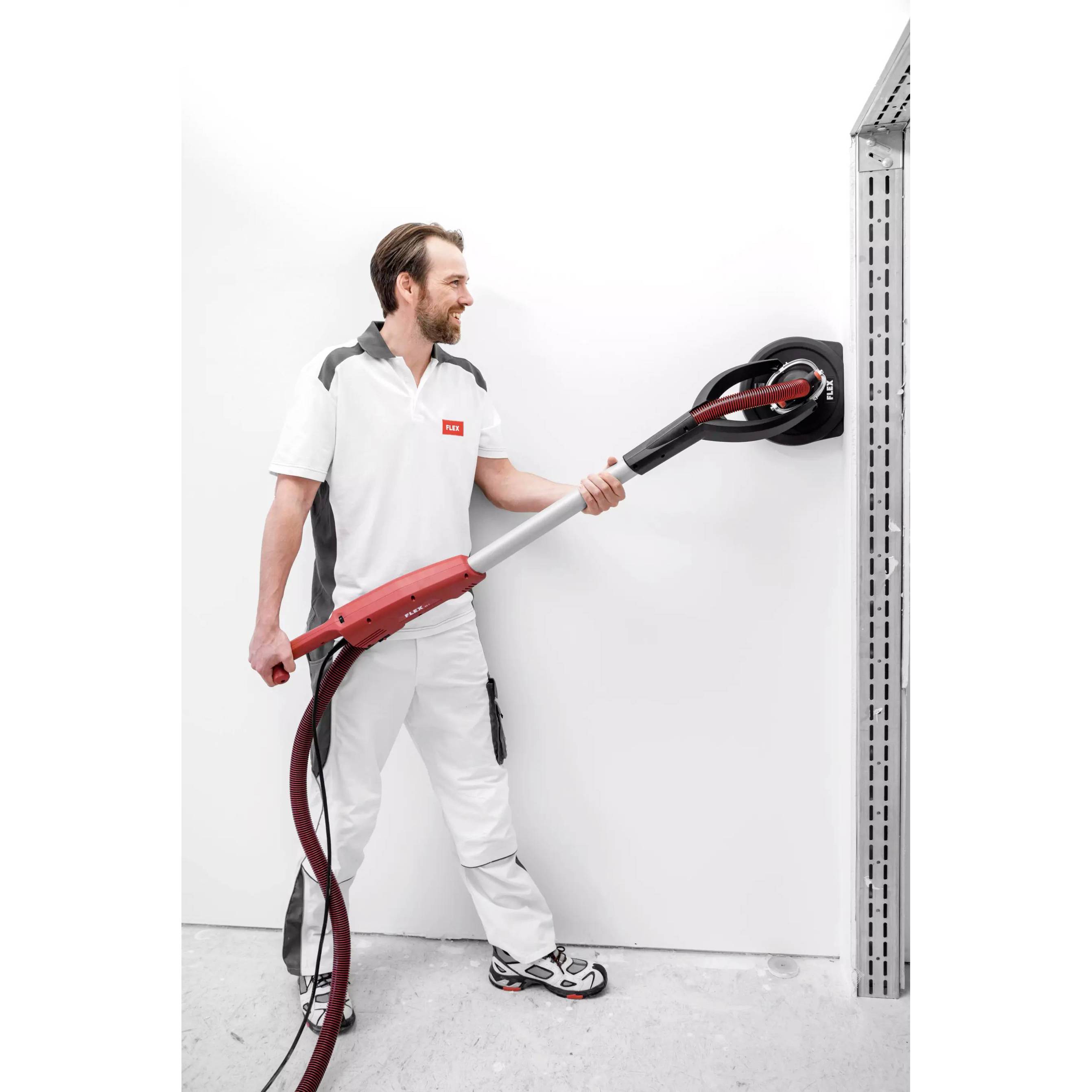 Sehr handliche, leichte Maschine mit optimalen Bedienungskomfort. Ermöglicht ermüdungsarmes und ergonomisches Arbeiten Ausgestattet mit innovativem Wechselkopf-System. Schleifköpfe lassen sich mit einem Klick anbringen und entfernen Exzenterschleifkopf mit 4 mm Hub, damit lassen sich mühelos perfekte Oberflächen im Q3- und Q4-Bereich erzielen Zuverlässige Kraftübertragung und hohe Flexibilität durch die flexible Antriebswelle. Seit Jahrzehnten bewährte „FLEX Technik“. Durch dieses Konstruktionsprinzip wird das Gewicht am Kopf der Giraffe® auf ein Minimum reduziert. Das erleichtert die Handhabung. Elektronik: mit Drehzahlkonstanthaltung, Sanftanlauf, Überlastungsschutz und Drehzahlvorwahl mit Stellrad Leichte Handhabung: durch optimale Balance zwischen Motor und Schleifkopf Die effektive Absaugung zwischen Bürstenkranz und Schleifteller verhindert ein Zusetzen des Schleifmittels und sorgt für staubfreies Arbeiten Anschlussmöglichkeit für die FLEX Sicherheitssauger mit dem FLEX Clip-System am Führungsrohr Staubgeschützter Ein-/Ausschalter Sehr flexibel durch eine optionale Verlängerung (Zubehör) um 500 mm für große Raumhöhen, werkzeuglos montierbar Mit dem umfangreichen Schleifmittel-Sortiment ideal geeignet für das Verschleifen von Gipskarton-, Vollwärmeschutz-Styroporplatten, sowie zur Lackiervorbereitung Die Bearbeitung von sehr großen Flächen und Raumhöhen bis 3,40 m ist durch den optionalen Einsatz des GM 340 möglich Mit dem innovativen, textilen Transportsystem lassen sich Maschine und Zubehör mühelos transportieren. Die Giraffe® muss nicht montiert werden, sondern ist sofort einsatzbereit Kardanisch gelagerter Schleifkopf sorgt für hohe Flexibilität und optimale Anpassung beim Schleifen an Wänden und Decken.