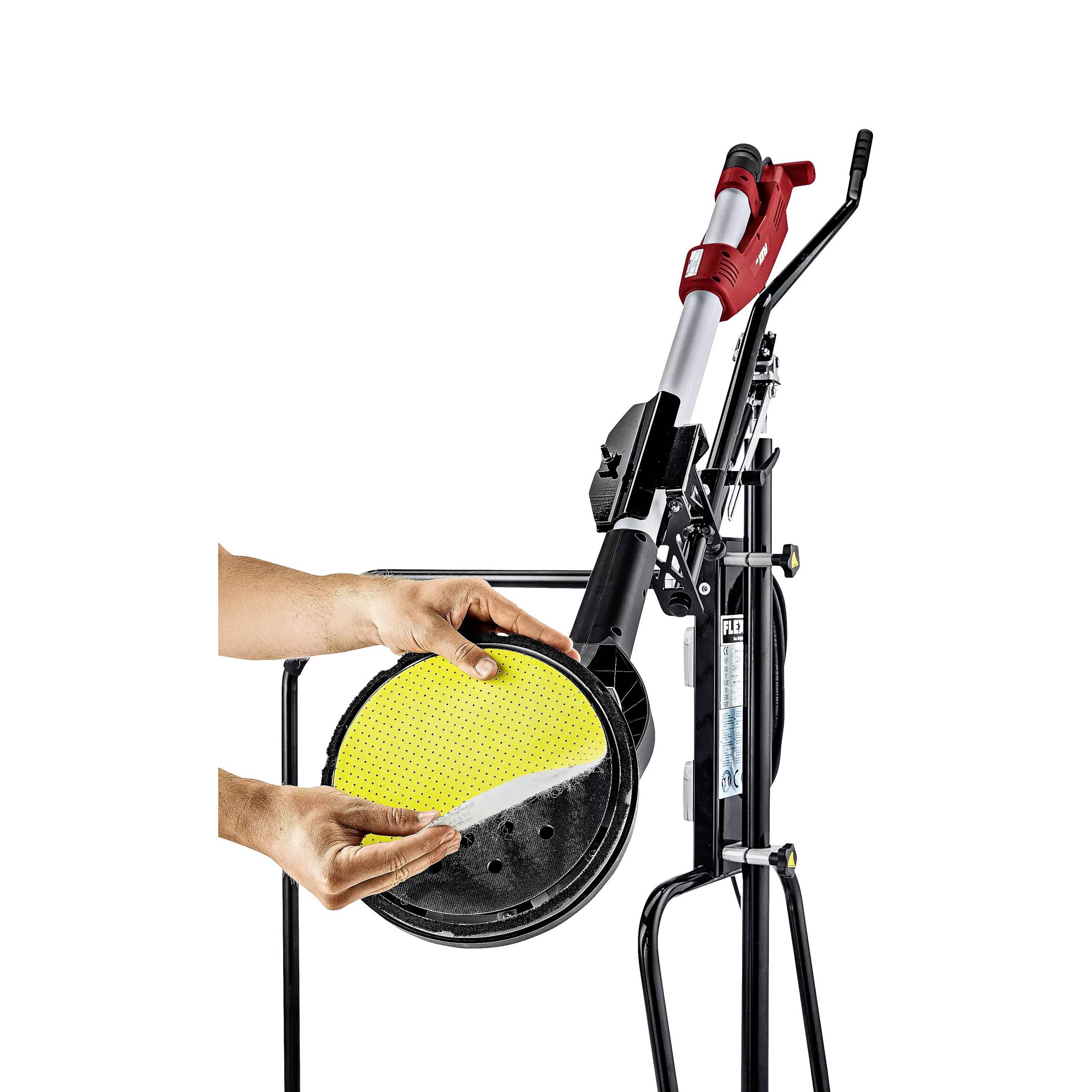 Mobiler Arbeitsplatz zur Montage der Giraffen Typen GE 7, GE 5 / R, WSE 500, WST 700 VV und WST 1000 FV, dadurch ist eine ausdauernde Arbeitsleistung ohne Einfluss des Maschinengewichts möglich Beachtliche Kraftersparnis für den Anwender durch Reduzierung von Ermüdung und Belastung Der mobile Arbeitsplatz verfügt über einen stabilen Rahmen für den robusten Einsatz auf Baustellen. Die gebremste Lenkrolle mit optimalen Laufeigenschaften gewährt punktgenaues und leichtes Manövrieren. Mit gewichtsoptimierter Bodenplatte für den FLEX Sicherheitssauger Werkzeugloser, schneller Wechsel der Giraffe® durch Einspannen in stabiler Werkzeugaufnahme. Sowie werkzeuglose Verstellung der Arbeitshöhe durch eine 2-fache Klemmung der Hubstange Optimaler Anpressdruck an die Schleiffläche durch Gasdruckfeder Werkzeugloser Auf- und Abbau durch Schnellspannelemente. Gestell verfügt über einen robusten Klappmechanismus für den einfachen Transport Ausgestattet mit einem gummierten Handgriff, Schlauchhalter und Möglichkeit zur Kabelaufwicklung des 7,5 m Gummikabels Große Gummiräder sorgen für eine optimale, gute Standsicherheit und Beweglichkeit auf Baustellen. Zusätzliche Abdeckungen an den Radnaben bieten Schutz gegen Beschädigungen an Wänden und Objekten Anschluss für Elektrowerkzeuge über 2 Steckdosen 230 V/CEE Schwenkbare Werkzeugaufnahme beidseitig um 90°, inkl. drehbares Gelenk für optimale Beweglichkeit, Anpassung an Decken, Wänden und für einen perfekten Schliff an schrägen Flächen Die Kunststoff-Gleitbuchse ermöglicht einen reibungsfreien Lauf sowie gefühlvolles Führen der Giraffen auf der Oberfläche