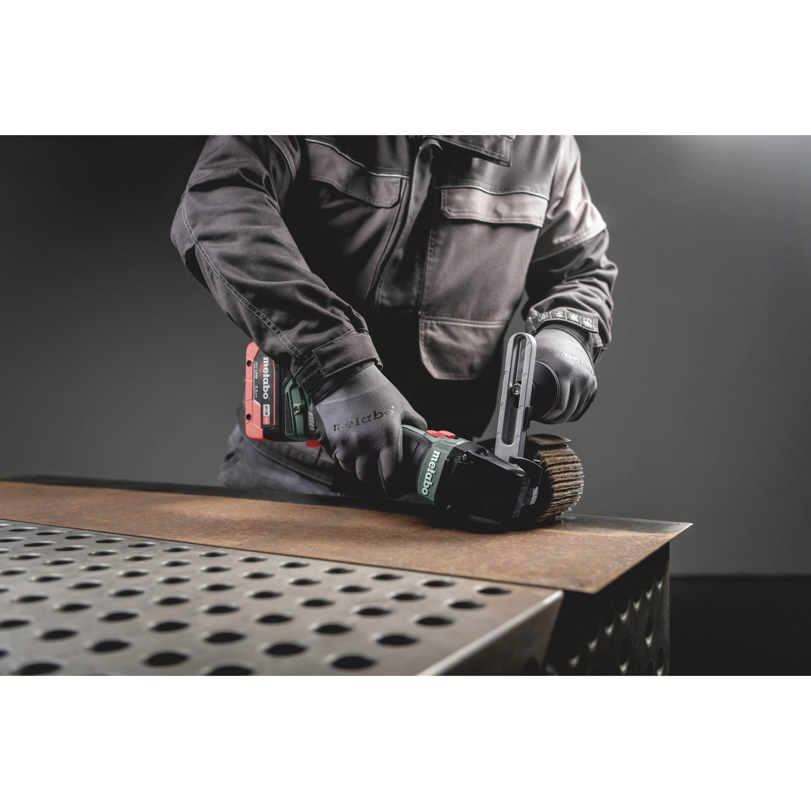 Kompakte Akku-Satiniermaschine mit Brushless-Motor zum Schleifen, Satinieren, Bürsten und Hochglanzpolieren von Metallen.