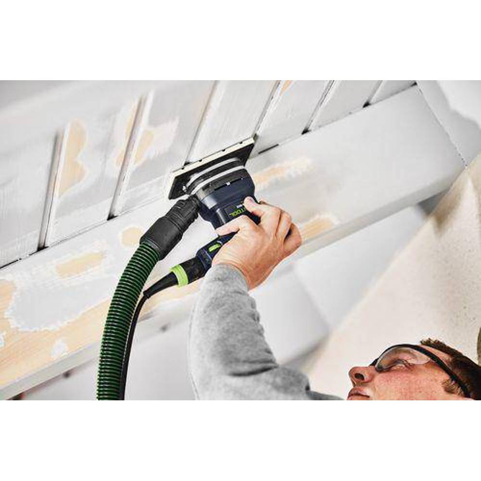 Gesund und weniger Nacharbeit: In Kombination mit Absaugmobil oder Longlife-Staubfangbeutel und aufsteckbarem PROTECTOR für schonendes Schleifen entlang von Fensterflächen, Rahmen und Füllungen